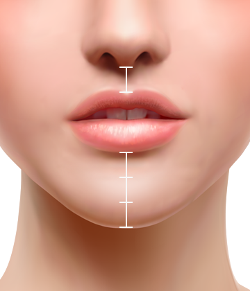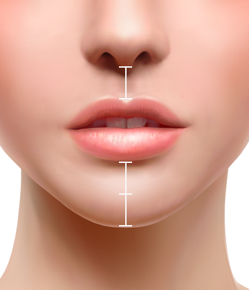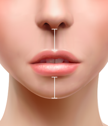 코끝에서 윗입술의 길이와 아랫입술에서 턱끝의 비례에 따라 1:2이 가장 이상적인 비율이지만, 일률적인 개념 보다는 각각의 개인 얼굴에 어울리는 조화로운 비율을 찾아야 합니다.