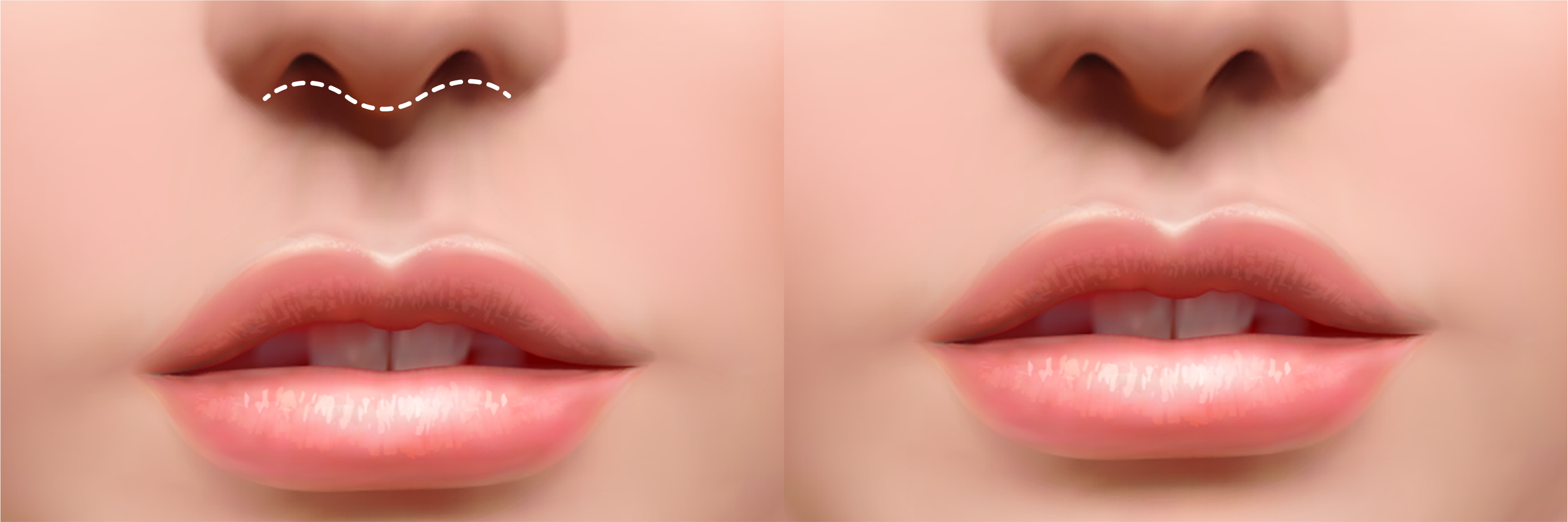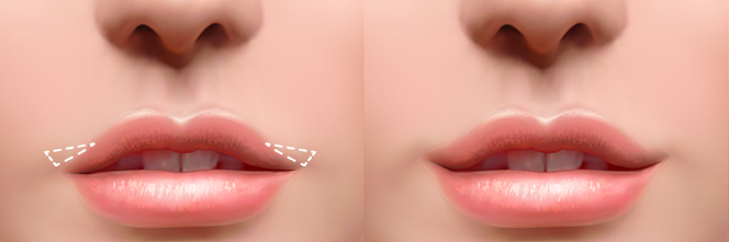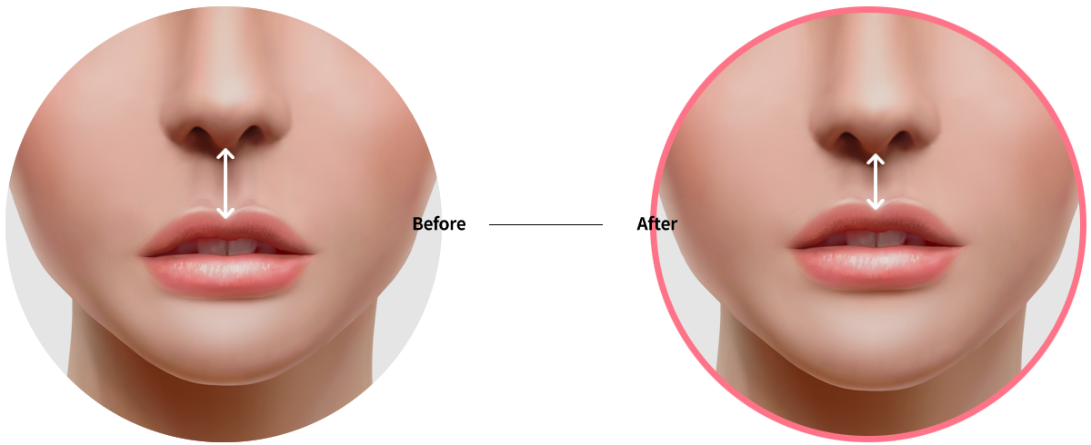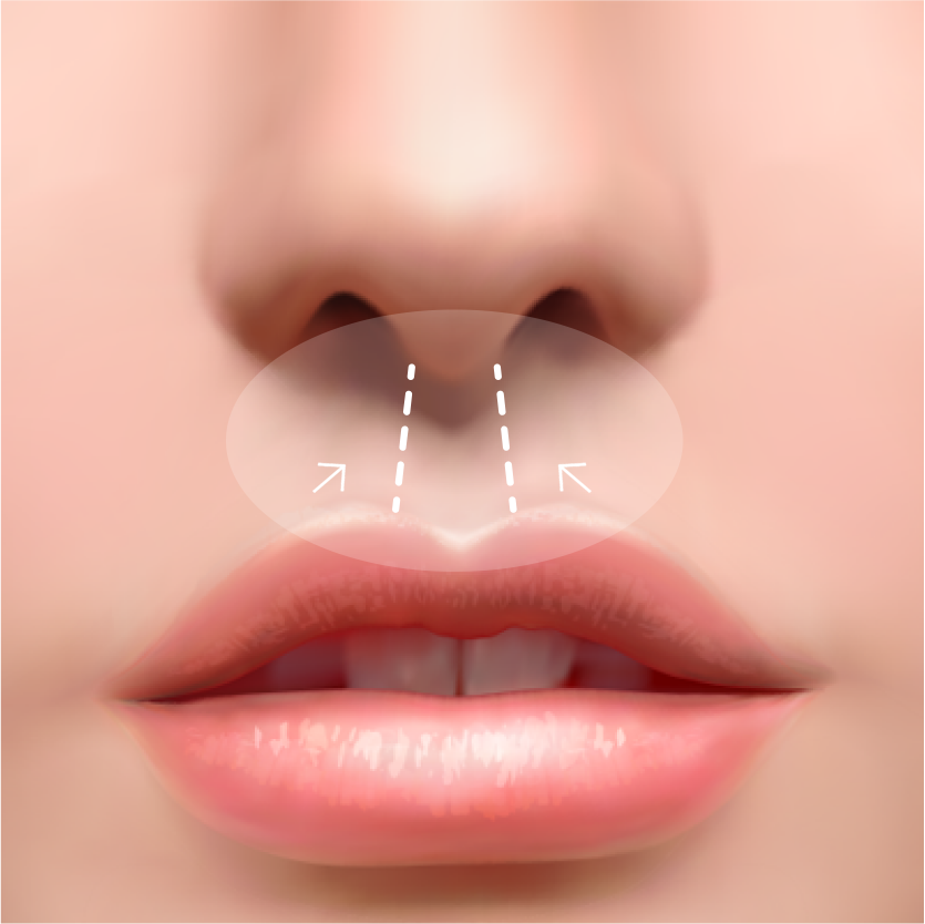 양쪽 입꼬리와 코볼이 이어지는 부위인 외측 인중의 길이를 축소하여 윗입술 균형을 바로 잡음과 동시에 동안 효과를 극대화 할 수 있습니다.