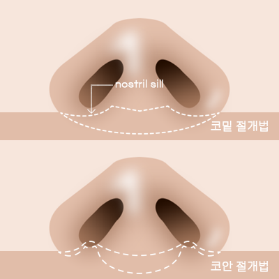 코와 입술의 경계 부위에는 nostril sill이라는 문지방 같은 부위가 있습니다. 자연스러운 코 모양을 유지하는 미세한 구조입니다. 인구의 약 60%에서 뚜렷한 nostril sill 모양을 가지며, 이때는 일반 코밑 절개법이 좋습니다. 인구의 약 20%는 평평한 nostril sill 모양으로, 코안절개법을 통해 흉터를 더 보이지 않게 합니다.