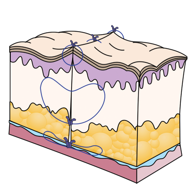 절개 부위의 높이와 외전(eversion) 모양을 맞춰 봉합하여 패인 흉터, 단차가 있는 흉터를 예방합니다.